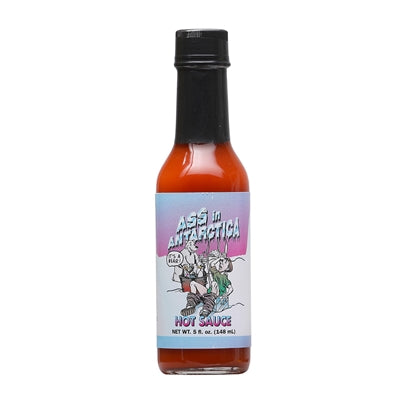 Ass in Antarctica Hot Sauce (5 FL.OZ. / 148 ml): When the heat becomes unbearable, do you feel like you need a vacation? We hear Antarctica is a nice place to chill out. This is the cheapest fare available. One swig and you'll be on your way. Caution, this pepper sauce is seriously hot. In fact, this is about as hot as it gets. It might sound like we're bragging, but really we are just giving you advance notice that its going to bun on the way in and ...well, you get the picture. Ass in Antartica hot sauce is a moving experience. Ingredients: Cayenne Pepper, Water, Salt, Acetic Acid, Oleoresin Cayene, Starch, and Caramel Color.