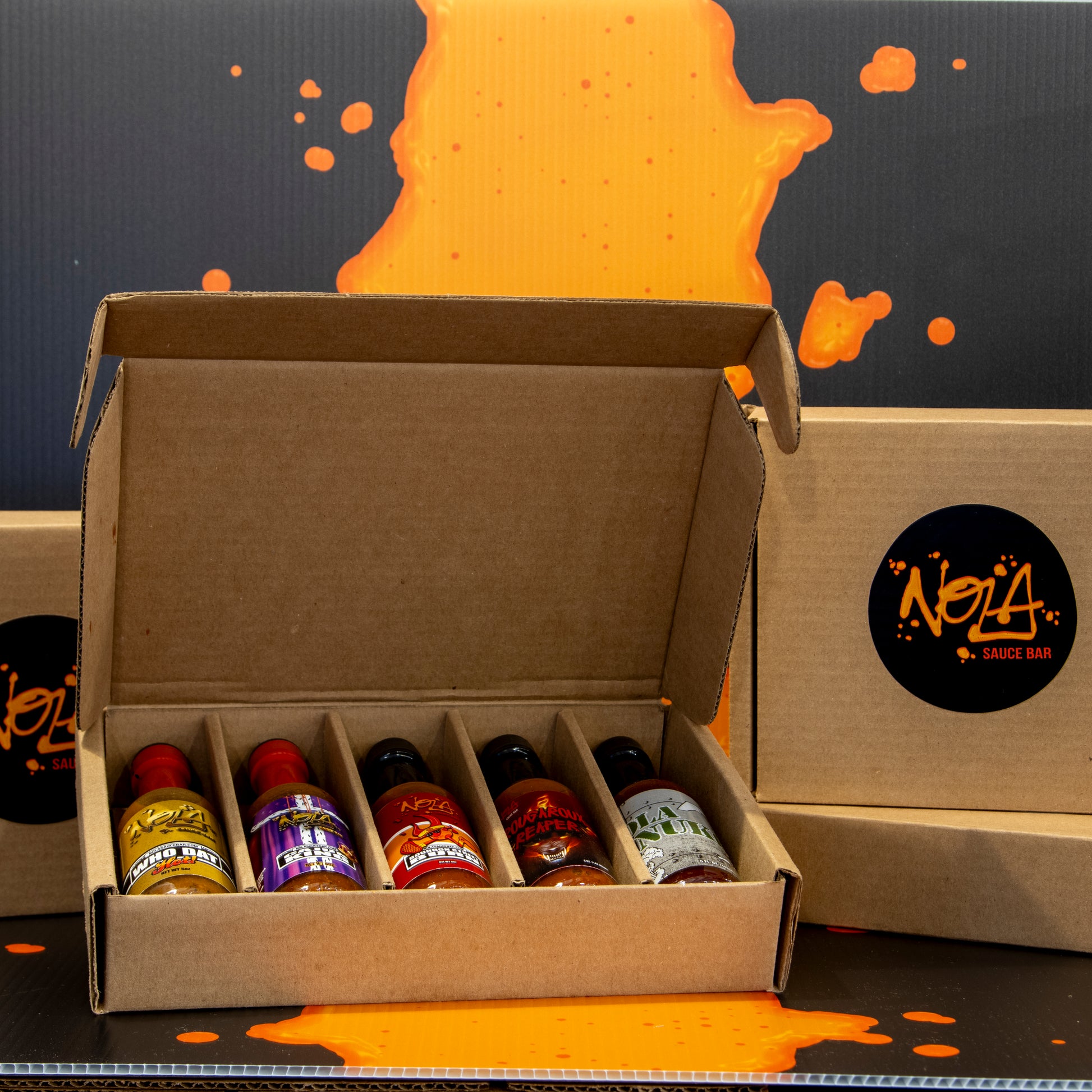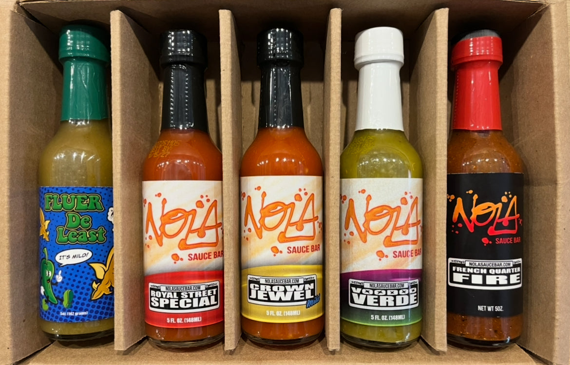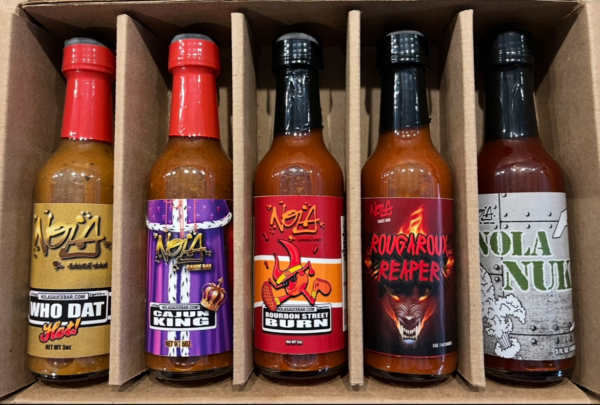 Welcome to TRIAL BY FIRE, a wild ride that takes you from calm to full blown flavor detonation. Start with zero heat, then climb through ten increasingly spicy bottles… use wings, chips, or dab straight out of the bottles until you reach the final boss, The NOLA Nuke!